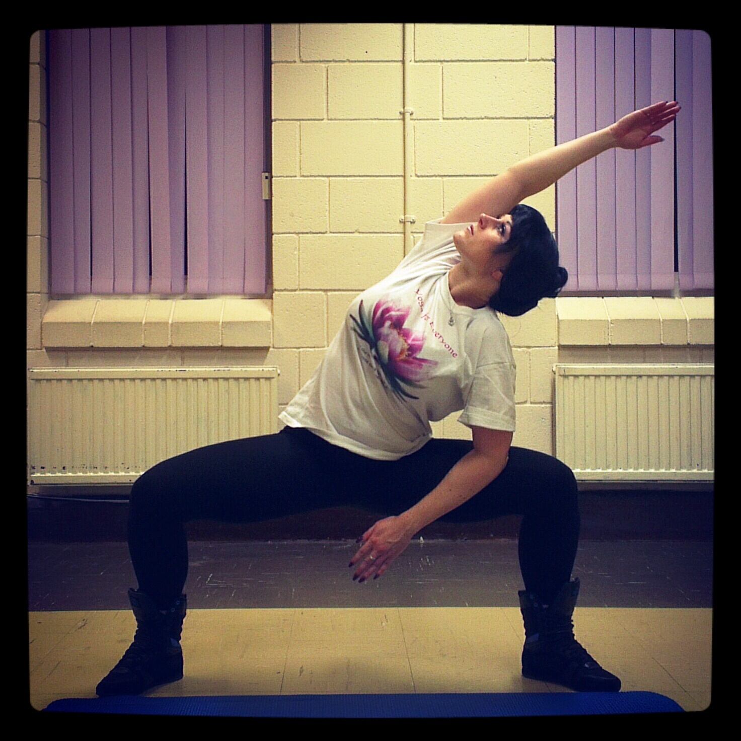 Sit with your legs wide and lean forward. Make sure your toes are pointing up. Stay for 10 breaths. Then, sit up slowly, bend your left knee, so the feet is in front of you and stretch your right leg up in front of you. Make sure your back is straight. Stay here for 5 breaths and repeat with the other leg.